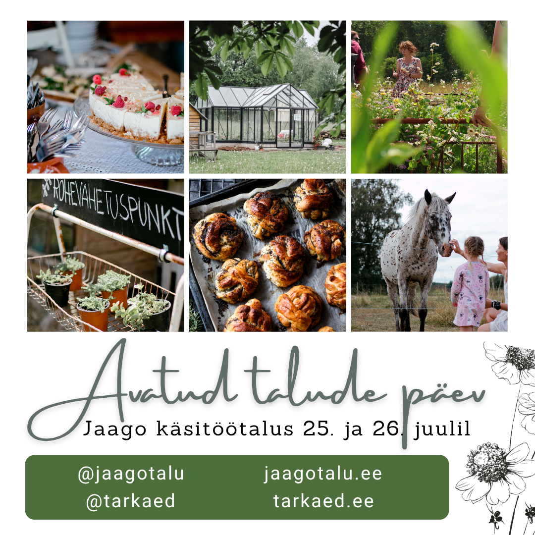 25. ja 26. juulil on Jaago talu ja aia väravad valla, sest avatud talude päev on jälle käes! Tule ja vaata, kuidas käib ühe saja-aastase talukoha tänapäevane maaelu. Käsitöö ja ise tegemine, aed ja peenramaa, lapsed ja loomad, hea toit, töö ja puhkus- kõik see on osa meie elustiilist ja jagame seda heal meelel sinuga ka! Koostöös hea naabri Variku taluga, saad tuttavaks taluloomadega.